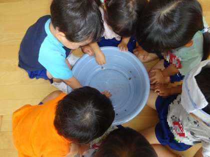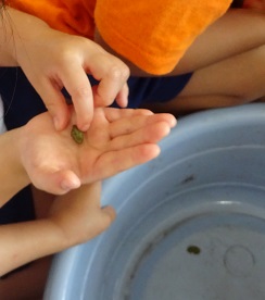 小さなアマガエルを、力の加減をしながら触っていましたよ。