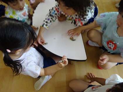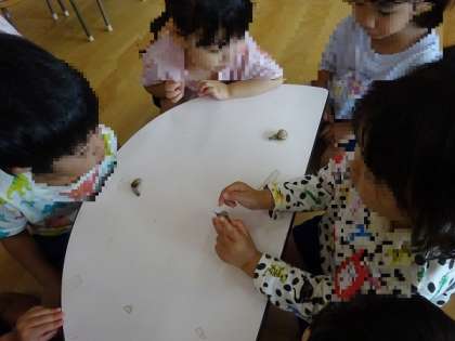 子どもたちは、歌を歌いながらカタツムリに触れていました。