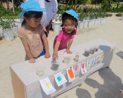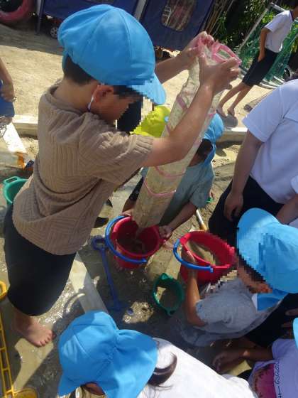 だんだん暑さも増してきて、より水や泥遊びが気持ちよくなってきました。泥遊びはペットボトルで道をつくったり、水の流れを見たりして楽しんでいます。色水遊びでは、ジュース屋さんをしておりいろいろなジュースをつくっています。