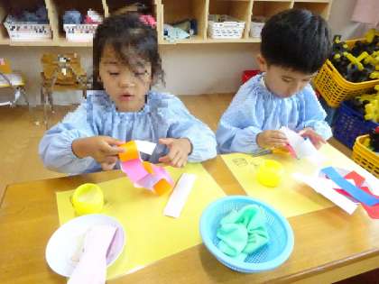 今日は午前中、土砂降りの雨だったので、保育室で折り紙を使って輪つなぎ遊びをしました。