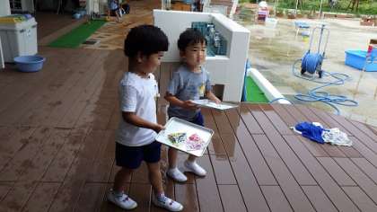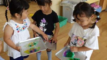 ペンの色や、描いたものの大きさなどインクがにじんでいく様子を友達と一緒に楽しんでいます。