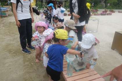 水遊びでジュースを作ったり、泥んこ遊びで池や川を作ったり、水をたくさん使って楽しく遊んでいました。