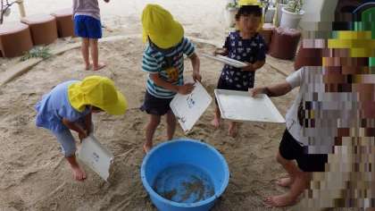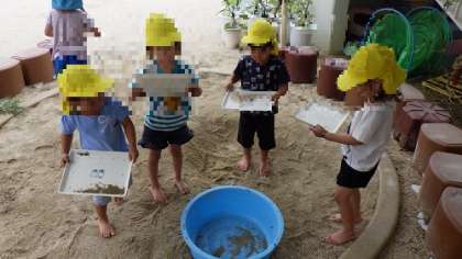 子どもたちは小さい方の砂場で、さらすなを作れることを知り、友達と取り組んでいます。
