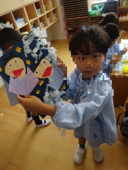 「一年に1回しか会われへんのかわいそうやな」「天の川っていっぱいの星があるよな」など、七夕に親しみをもち始めています。今日は織姫、彦星をつくって遊びました。