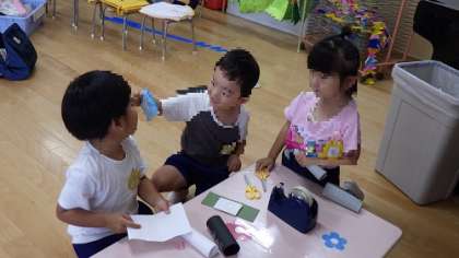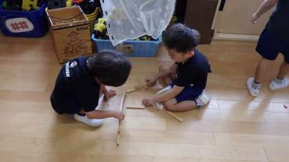 友達と作って遊び始める子どもたちや、カプラをする子どもたち。また、デンで遊び始める子どもたちもいます。