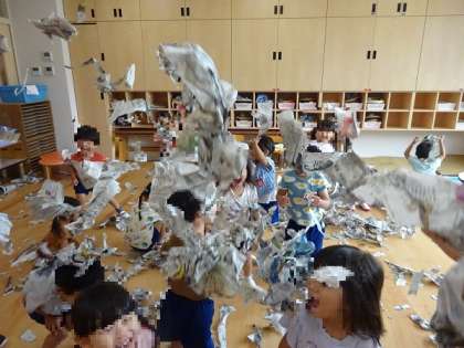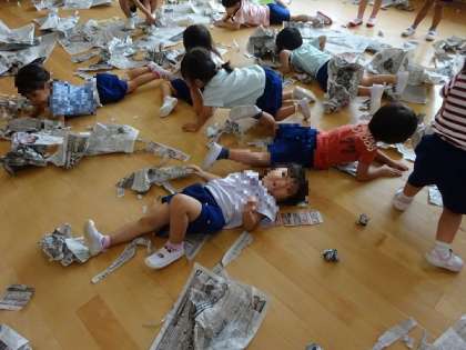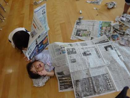 新聞紙で遊んだよ(3歳児)