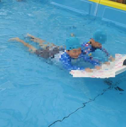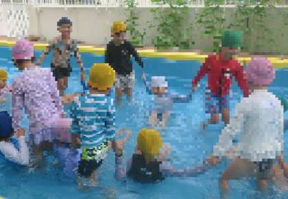 顔つけにチャレンジしたり、泳いだり、手をつないでメリーゴーランドをしたりして水を全身で感じて遊んでいます。