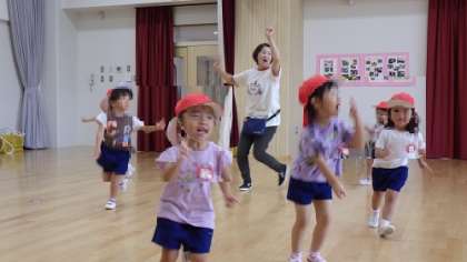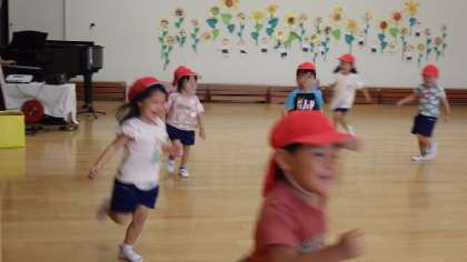 担任の先生が「逆に回ってみよう」の合図で、くるっと振り返って逆に走る様子もあったり、体の向きはそのままに後ろ向きに歩く様子もあったり・・・。