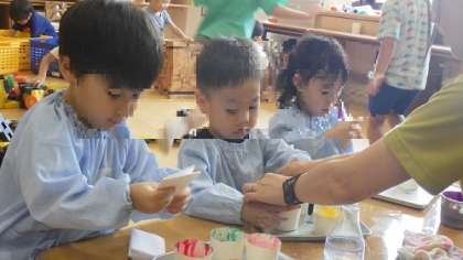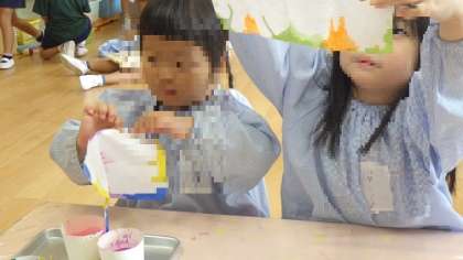 紙を折って、絵具を付けて偶然できる模様や絵具が滲む様子を楽しんでいました。