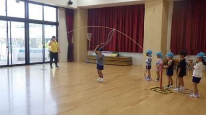 遊戯室で十分遊んでから、戸外でも挑戦します。