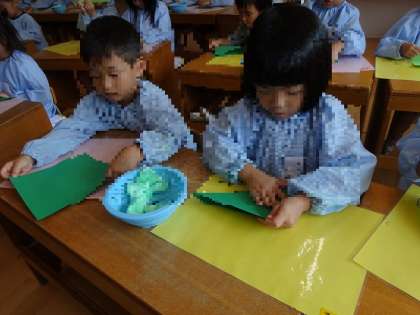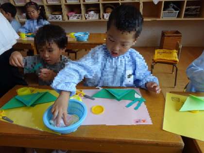 バッタをつくったよ 公開日 2024/09/06 更新日 2024/09/06 お知らせ みんなでバッタを見た後は、画用紙を使ってバッタをつくりました。 実際にバッタを見たこともあり、「おっきい足つくろう!」「足曲がって三角になってたで」「頭にもピョンってなんかついてた」 と、よく見ていたことで、イメージもありつくる意欲も高まっていました。 「こんな風につくりたいな」という思いが作品に表れていましたよ。出来上がると、「かわいいバッタさん見てみて」ととても嬉しそうでした。 いいね(0)