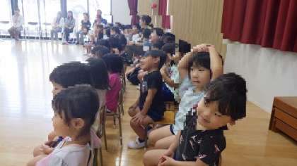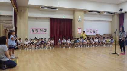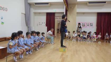 8・9月生まれの誕生会 公開日 2024/09/10 更新日 2024/09/10 お知らせ 8・9月生まれの子どもたちの誕生会がありました。 自己紹介をしてお家の方からお祝いのメッセージをいただきます。 今年度から先生たちもお祝いするようにしたので、3人の先生たちも一緒にお祝いです。 先生たちの自己紹介は、子どもたちにとってもウキウキするようです。 興味津々で聞いていました。 いいね(0)