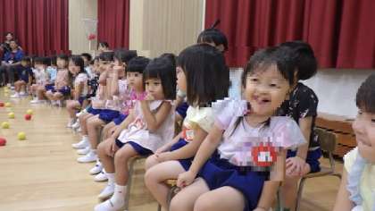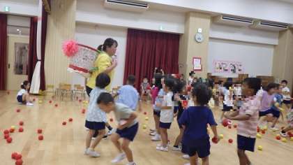 先生が背負ったカゴに玉を入れますが、なかなか難しいです。