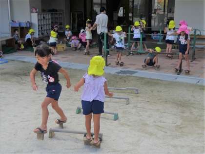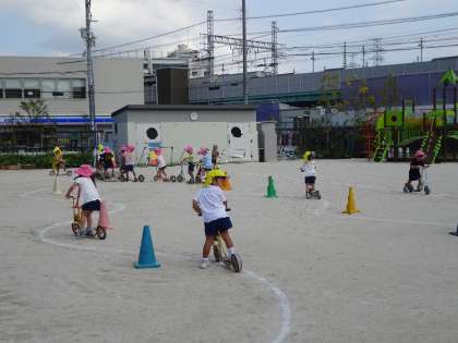 スクーターでいろんな道を通ってみたり、下駄を履いて歩いてみたり、、、いろいろな遊具に挑戦しています。
