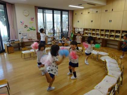 保育室に置いてあるポンポンを見つけて、「これ!楽しいね」と笑顔で踊っていました。