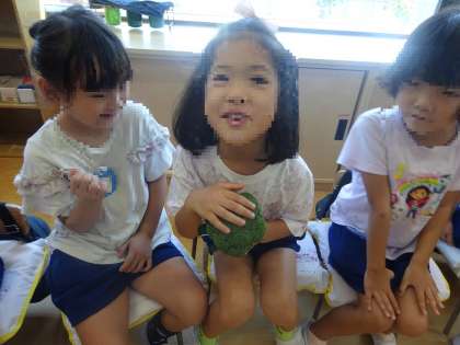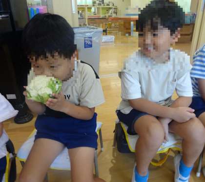 匂いを嗅いだり、触れたりしてブロッコリーとカリフラワーの違いを自分なりに考えていました。「ごつごつしているね」「似てるけど、匂いが少し違う」など友達同士で話し合っていました。大きく生長するのが楽しみですね!