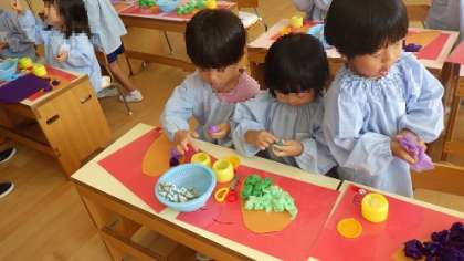 3歳児の保育室では、薄い花紙をつかってブドウをつくっていました。