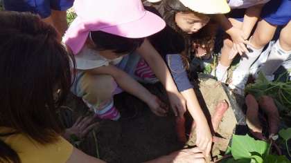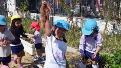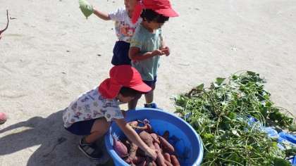 芋ほり 公開日 2024/10/11 更新日 2024/10/11 お知らせ なかなか抜けない芋は、先生も一緒になって掘っていました。 また、掘れたお芋に興味津々の3歳児。 「お芋さん、土の中で寝むっていたんだって」と先生は声をかけていました。 3歳児は、初めての経験でもありますので、大きなお芋にびっくり! いいね(0)