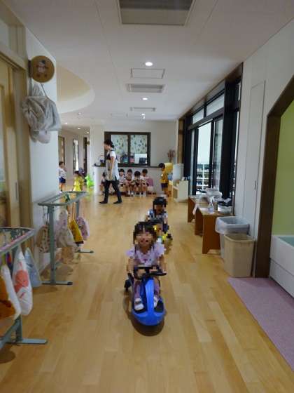 5台のスウィングカーを、交代しあって遊ぶいちご組さん。