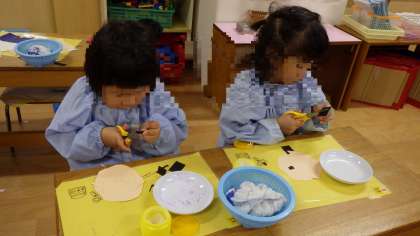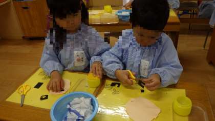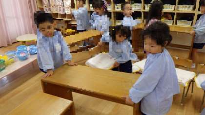 製作あそびの前に今日から自分たちで机を並べることにしました。先生から運び方や気を付けることを聞き、ペアで運びました。2人で息を合わせて運ぶのは難しく、ゆっくりゆっくり運びました。家で机を運ぶという経験はなかなかないと思います。これから毎日自分の机を自分で準備して製作遊びをしたり、お弁当を食べたりしていきたいと思っています。(写真1)