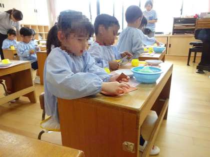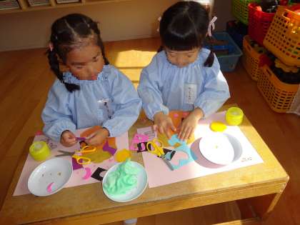 「先生、帽子かぶってたよ〜」「目と口も付けて顔にしよう〜」「笑っているねん」という声が出ながら、個々に思い思いにドングリを表現していました。「帽子に模様付けよう」といろいろな色の画用紙を使って貼り付けていました。