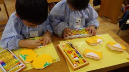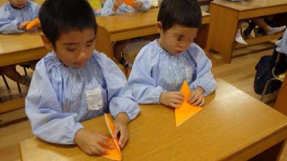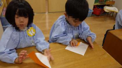 昨日収穫した柿が嬉しかったようで、「柿たべたよ!」と登園してきて話をしてくれる子どもも見られました。今日は経験したことをおりがみで表現しました。先生から「角と角をピタッとあわせるよ」と聞くと角をあわせようとしますが、紙が動いたり、ずれたり、うまくいきません。根気よくあわせようと頑張ってできるとすごく嬉しそうに微笑んでいました。(写真1)(写真2)