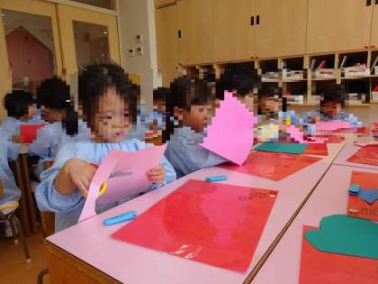 ハサミで切って、ひもとおし(3歳児) 公開日 2024/10/26 更新日 2024/10/26 お知らせ ハサミの経験を積み重ねています。 ハサミを使えば使うほど、どんどん上達してきます。 でも、「慣れ」から扱いが雑になることもあるので、安全に使用できるように ハサミの使い方をいつも伝えています。 ひもとおしです。 小さな穴をじーっと見つめて、ひもを通していました。 小さな手で、一生懸命です。 一人一人の、個性豊かな作品ができました。 いいね(0)