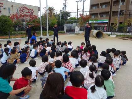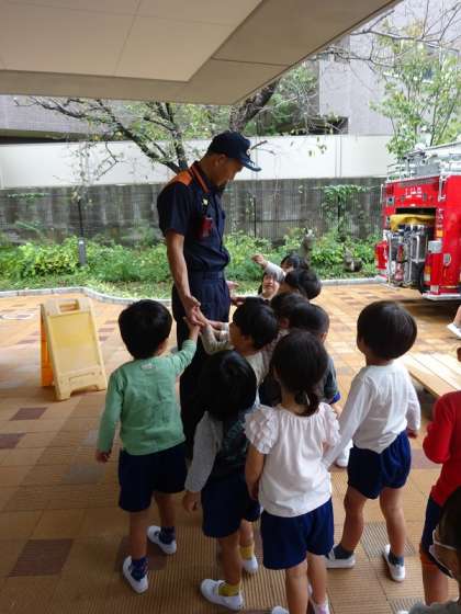 此花消防署の消防士さんが来てくださり、避難訓練をしました。