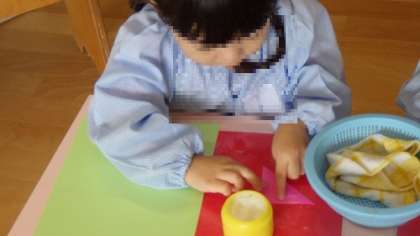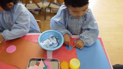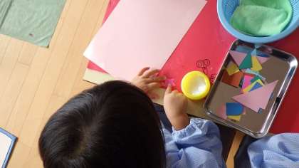 「1本の指で糊をつけて、画用紙に貼ってごらん」と担任は子どもに投げかけ、子どもたちは遊んでいます。