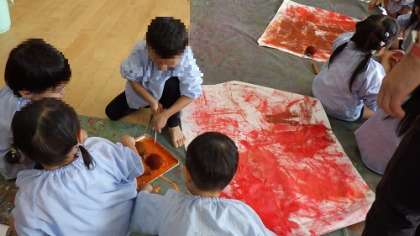 色が混ざることが楽しい4歳児もいれば、ローラーを動かすことが楽しい様子の4歳児もいます。