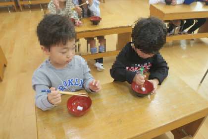 難しそうな子も、慣れた手つきで箸を扱う子もいますが、みんなで小豆つかみにも挑戦しました。