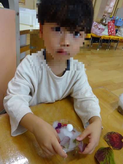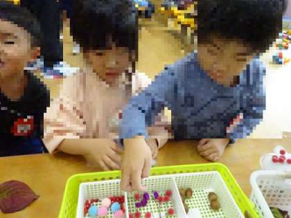 デザートづくり(3歳児) 公開日 2024/11/05 更新日 2024/11/02 お知らせ 園庭での秋集めで見つけた、木の実、葉っぱなどを使って、ごちそうをつくりました。 いちご組さんは、ごちそうつくりが大好きです。 透明のカップ、綿や、ドングリを一緒に置いておくと 「パフェつくるー」 「ぼくはカップケーキ」 と、つくり始めましたよ。 甘くておいしいデザートができました。 身近な自然物を使って、秋ならではの遊びを楽しんでいます。 いいね(0)