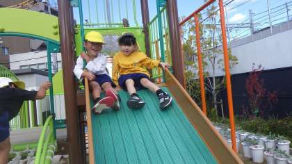 友達と一緒に滑り台を滑るのが楽しくなっています。