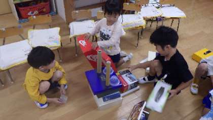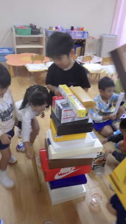 今日はお家の方が集めてくださった素材を使って並べたり積み重ねたり、組み立てたりして遊んでみました。友達と一緒に積み重ねることを楽しんでる子もいました。
