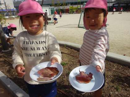 戸外遊びの後、「寒くなってきたね〜。落ち葉がたくさんあるね。茶色や赤の葉っぱあるね〜、木から落ちたんだね。」と言いながら、落ち葉拾いをしました。