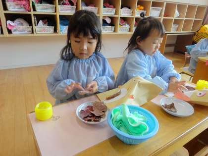 「木の上にフクロウとまらせよう。」と子ども達と話しを合って、フクロウを作りました。さっき拾った落ち葉を体に付けようと中にはパリパリとした葉もありながら、「パリパリ取れてきた〜、小さくなった〜」と貼り付けるのに苦戦しながら葉を付けています。出来上がったフクロウを「見て〜」と嬉しそうにしています。