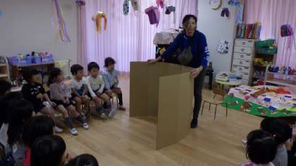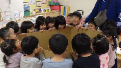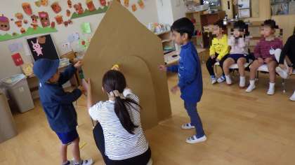 作ることを楽しんでいる年中のおともだち。個々で作るものが今まで多くありましたが、今日はクラスのみんなで1つのものを作る活動をはじめました。「この大きな段ボール何に変身しようかな?」クラスの先生が話すといろいろな意見をこどもたちか話してくれます。クラスのみんなでイメージを共有していくことは簡単ではありません。こどもとのやりとりの中で先生はイメージがもちやすいように具体的な言葉にしたり、「こんなかたちかな?」と見せたりしていました。