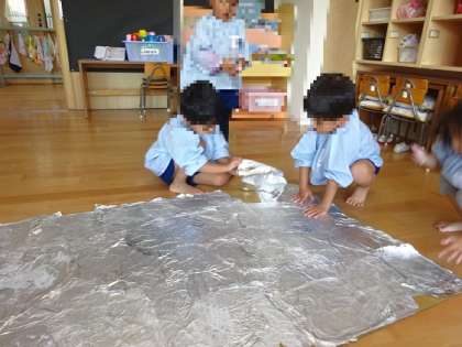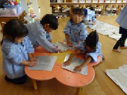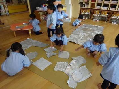 「電車つくろう」3歳児 公開日 2024/11/11 更新日 2024/11/11 お知らせ 電車にのって園外保育に行った楽しい経験から「電車つくろう」 「銀色にしたい」 アルミホイルを、板段ボールに貼りました。 さあ、どんな電車になるのかな?とても楽しみだね。 いいね(0)