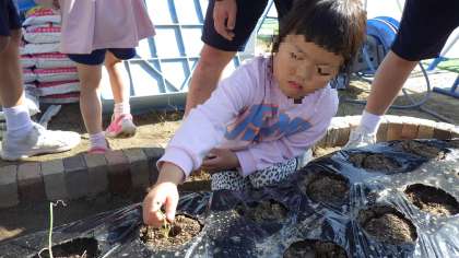 今日は玉ねぎの苗を植えました。「この苗が玉ねぎになるんだよ」と話すと不思議そうに「ほんと?」「どこにできるん?」と興味深々でした。先生から植え方を教えてもらうと、指で穴をあけ、そっと苗を植えていました。収穫は来年の春です。ほしぐみ、ゆきぐみのお友だちが年長組になってからです。楽しみですね。