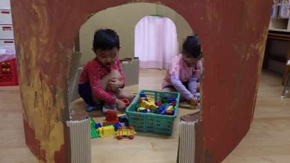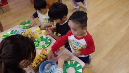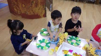 朝、登園してきてすぐ(朝の支度の前)に、子どもたちは先生が準備した環境を見つけ、「やりたい!」と言っていました。