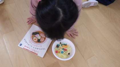 作って遊んだものをひっぱりだしてきて、家にして遊んだり、昨日つくったラーメンをもう一度出してきて、絵本と見比べてみたり、作ったものを大切に大切に遊んでいます。