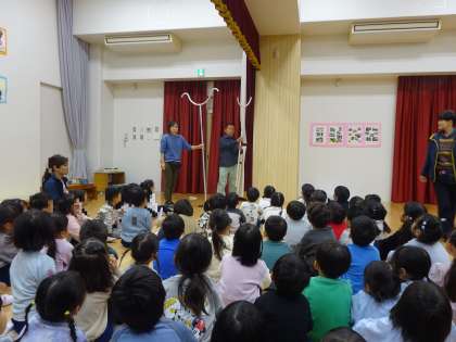 先生から「この棒は“さすまた”といってみんなを守る道具だよ」と聞くと「そうなんだ」とうなずいていました。教職員間でも様々な場面を想定し、子どもを安全に避難するべく話し合いを重ねています。