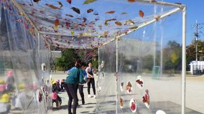 今年は“園全体を作品展”をテーマに、外も子どもたちの遊んでいることや、楽しい遊びを展示しています。
