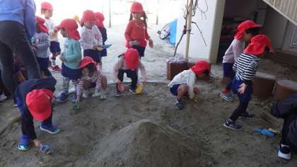 外で、先生と子どもたちは砂場や園庭を飾りつけていました。