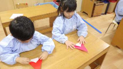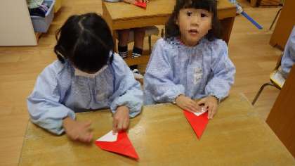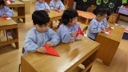 折り紙を折ったよ(4歳児) 公開日 2024/11/27 更新日 2024/11/27 お知らせ 今日は折り紙に挑戦しました。 「何ができるかはお楽しみ」と言って折り進めました。 何回か取り組んできたこともあり、『角と角を合わせる』ということを丁寧にしようとする姿がたくさんありました。 出来上がった形を見て、「サンタさんや!!」と大喜びの子どもたち。 個々にかわいい顔をかきました。 明日はツリーにつけるのを楽しみにしています。 いいね(0)