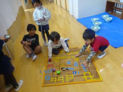 こま回しに挑戦しているところです。回っているこまを見て喜んでいます。ひもを巻くには力加減が絶妙に難しく、崩れてはもう一度巻きなおし、繰り返し挑戦しています。コマの台は、自分たちで点数をつけて、点数の競い合いをしているようです。