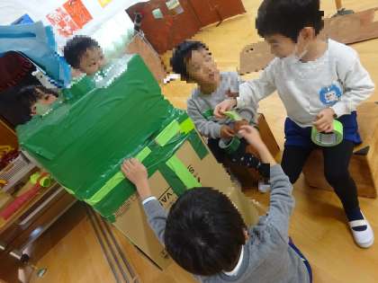 展覧会でつくった大きな船に乗り、わんぱくだんごっこをして遊んでいます。「たからじまの絵本に出てくるかいじゅうをつくりたい!」「ダンボールでつくろう!」「からだは緑色にするねん」と、友達と協力してつくっていました。まだつくっている途中だそうです。来週も続きをしましょうね!