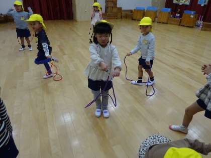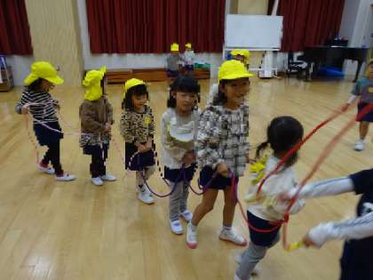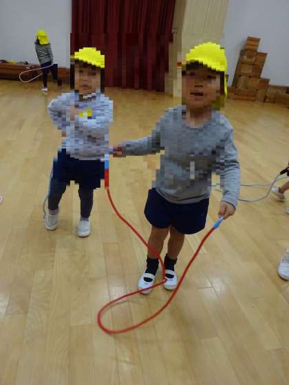 縄跳び遊び(4歳児) 公開日 2024/11/29 更新日 2024/11/29 お知らせ 今日は縄を使って遊びました。 どんなふうに遊ぶかな?と思ってみていると、 年長児の姿を見ての憧れもあるのか、 跳ぶ、ということに挑戦する姿がたくさん見られました。 「こうやって跳ぶの?」 「回してピョンやで」 「先生見て、2回出来たよ!」 と自分なりに意欲をもって取り組んでいました。 最後は「友達とつながったよ〜」「もっとつながろう」 と縄跳び電車ができていました。 いいね(0)
