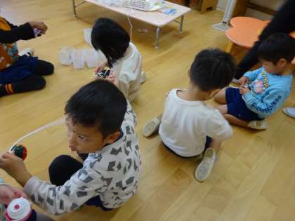 コマ回しでは、まずコマに紐を付けることからです。「できひん、取れた〜」と言っている声が聞こえながら、自分でやろう、コマを回したい気持ちがすごく感じられます。みんな諦めることなくもくもくとやっている姿が見られます。