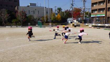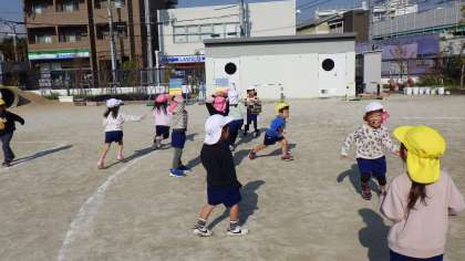 ルールをみんなで決めた後は園庭でも遊びました。追いかけたり、追いかけられたり、仲間を助けたり。寒い日が続いていますが、子どもたちは汗をかくほど走りまわってバナナ鬼を楽しんでいました。